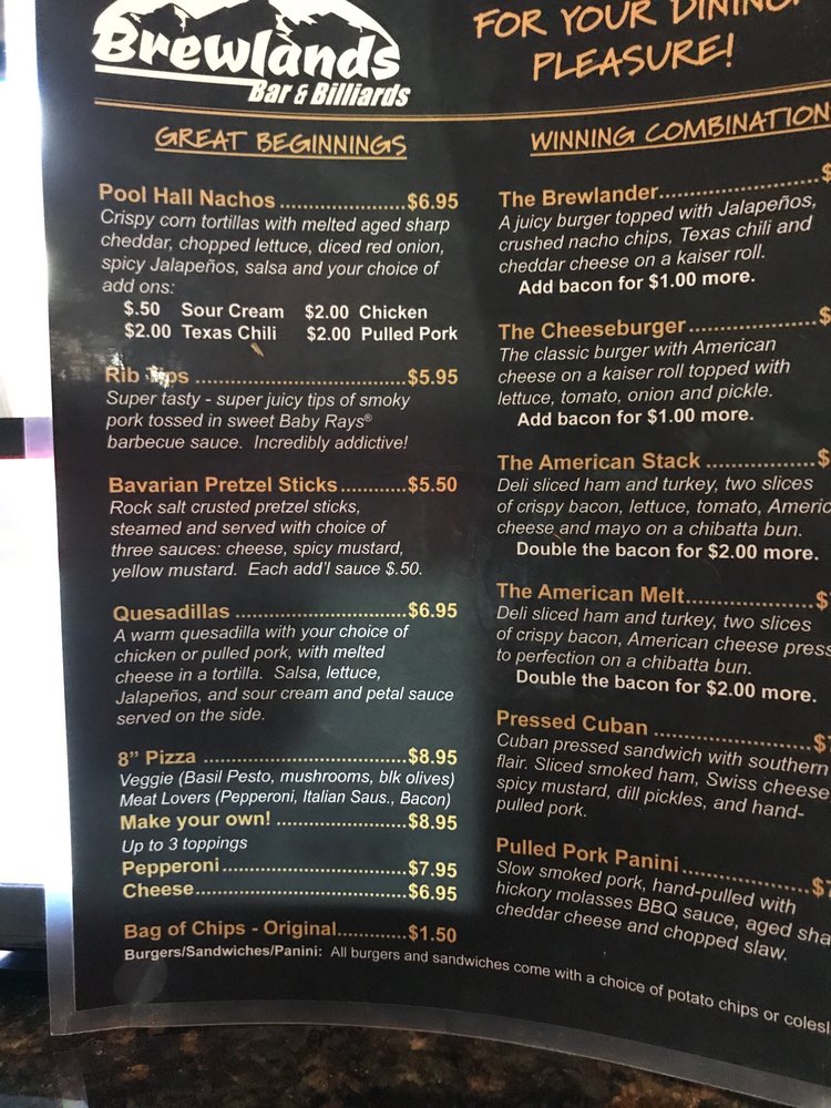 Welcome to Brewlands Bar and Billiards, where casual dining meets vibrant social space. Nestled in Tampa, the bar boasts a fantastic menu that complements its lively atmosphere. Patrons rave about the mouthwatering burgers and crispy tater tots, making it a local favorite. With a full bar and enticing happy hour specials, Brewlands is perfect for winding down after a long week.